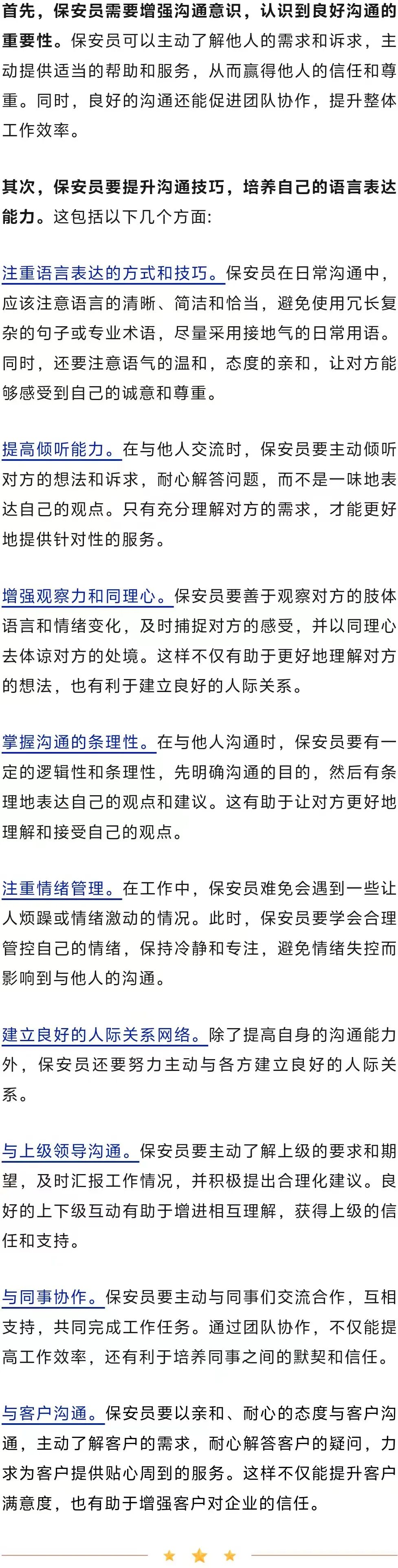 那么,作为保安员,应该如何提高自己的沟通协调能力和语言表达力,更好地与他人互动呢?
